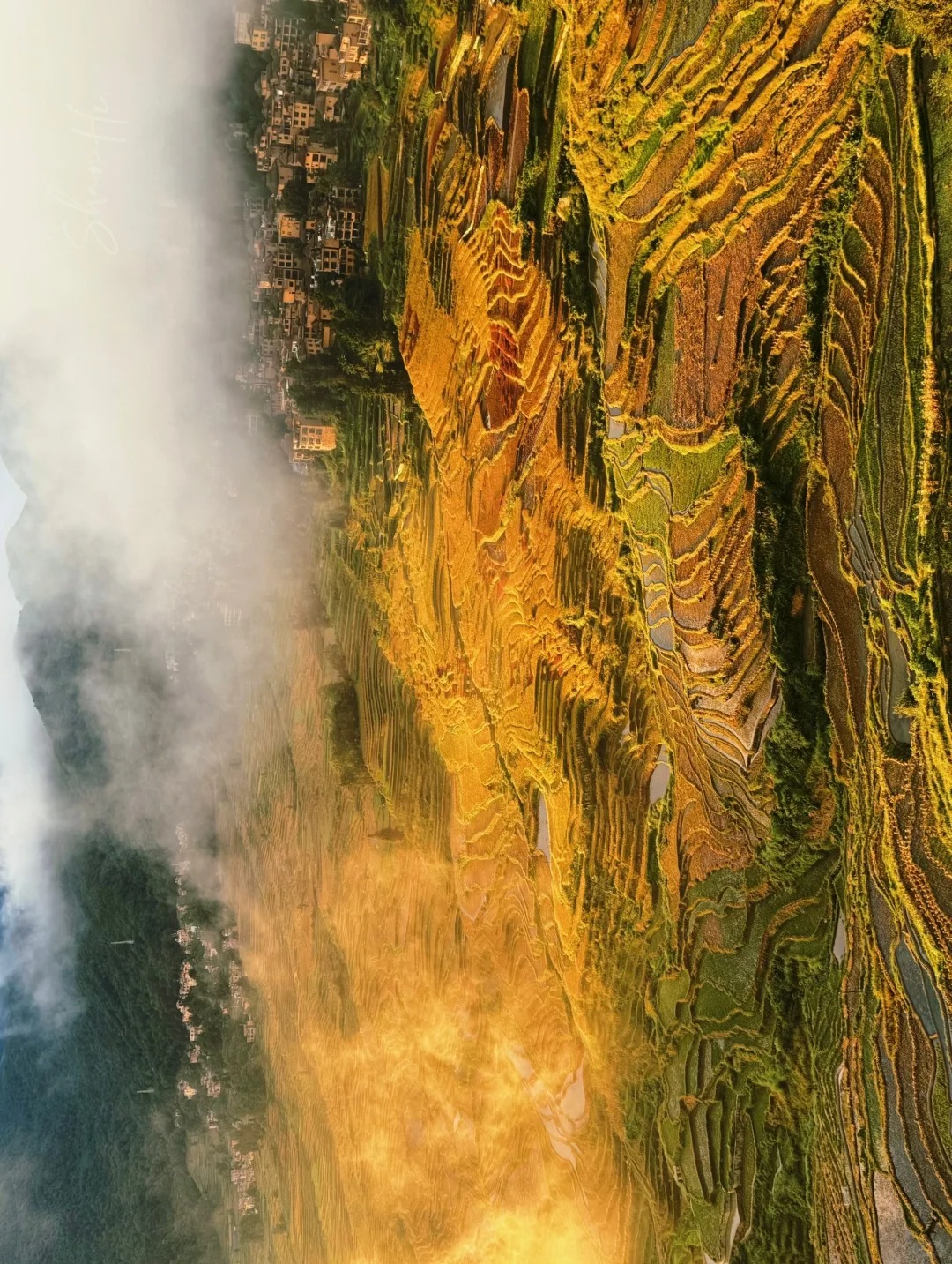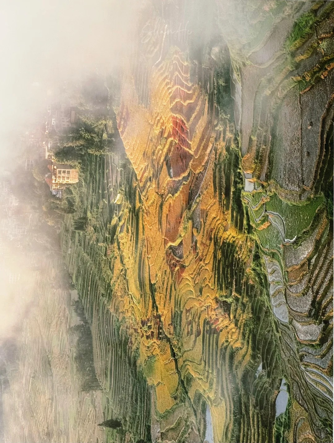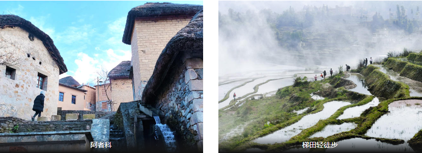 “山神水下阿姐正在洗衣服,转角处偶遇染布的阿婆,蘑菇房的小晒台上,彩衣迎风招摇,祭祀房和晒秋场旁,老人提着白萝卜正慢慢往上爬;古树广场和彩色梯田观景台,沿途梯田风光尽收眼底;