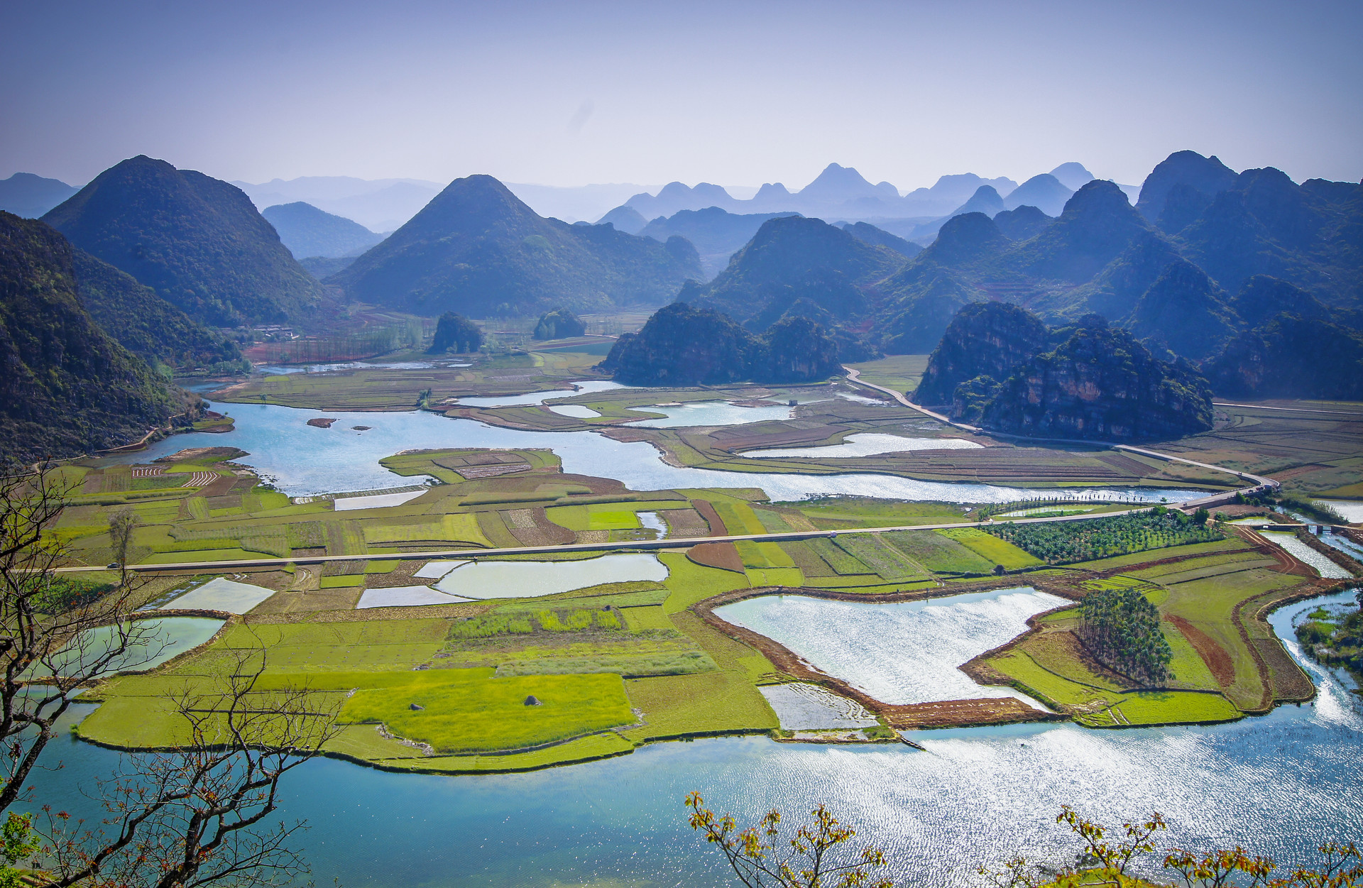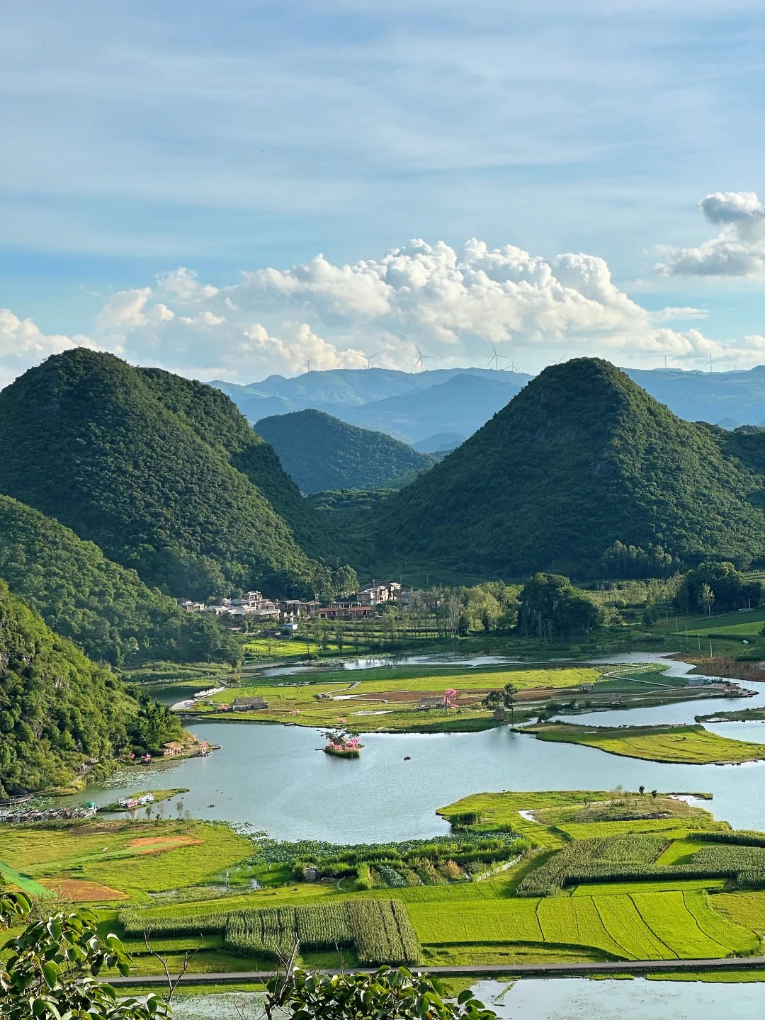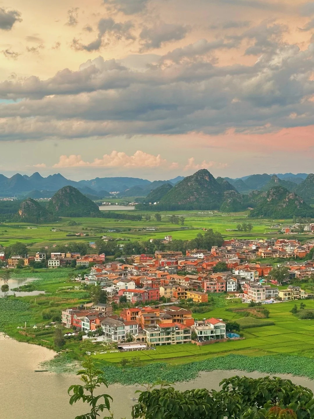 后前往游览菜花箐/青丘——探寻电视剧《三生三世十里桃花》影视拍摄地,站在山上俯瞰,远处孤峰林立,薄雾缭绕,山下湖光潋滟,炊烟袅袅,一派亦真亦幻的山水田园风光。晨起理荒秽,带月荷锄归,这里不是世外桃源,却有着最诗意的生活。