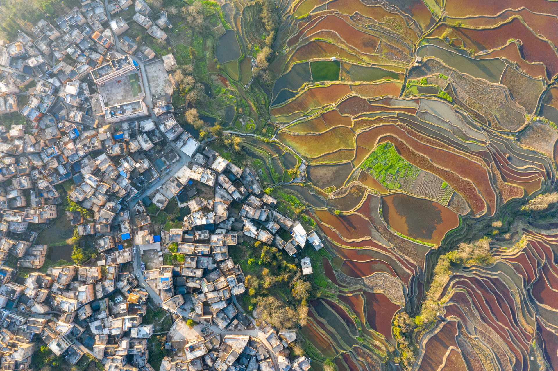 远处有袅袅炊烟起,近处有村民正在田间劳作,一群鸭子在红梯田里集体觅食,治愈感瞬间升腾起来,仿佛它们拔开的红藻变成了小花,落在心间;