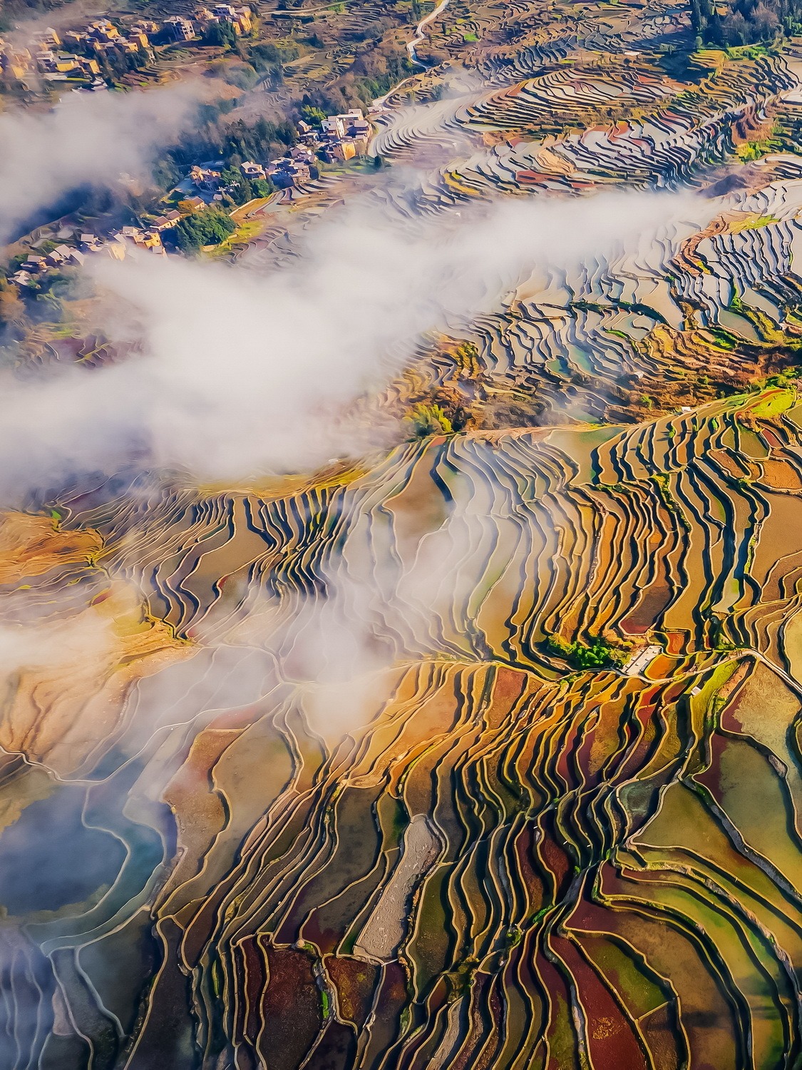 梯田集中连片核心区域主要有坝达、多依树、老虎嘴等 3 个片区。多依树的梯田适合观赏日出,清晨阳光洒在梯田上,金光漫射;坝达梯田有 3700 多级,日落时景色壮观,冬春灌水期可见 “千万颗太阳散落” 的奇观;老虎嘴景区的梯田形似奔腾骏马,气势恢宏,被誉为 “大地雕塑”。