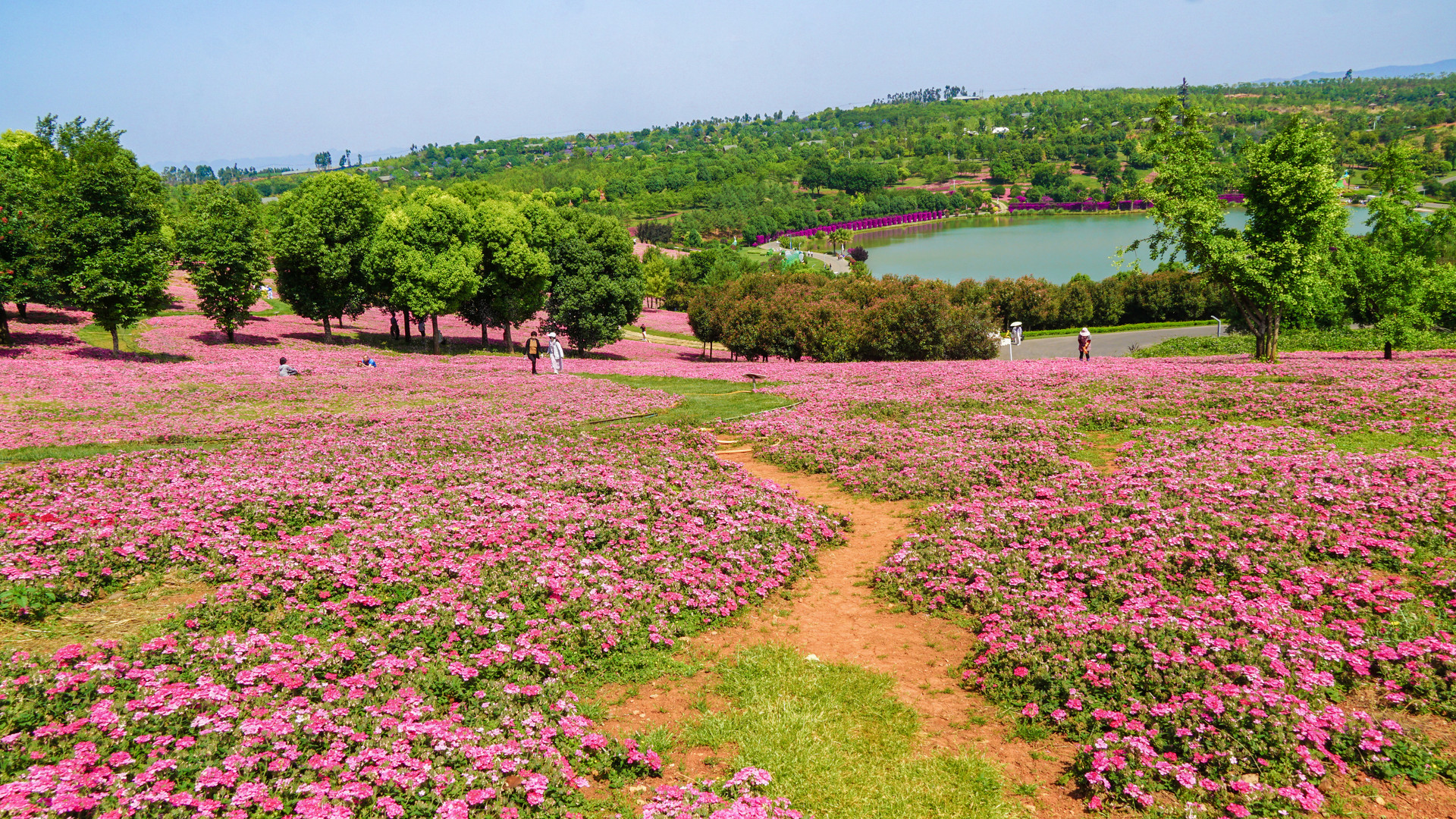 白沙环绕的人工湖畔,碧蓝的天空倒影在水中,树影婆娑,花草交映,美不胜收。