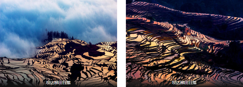后前往【坝达梯田】观看日落(游览时间60分钟)。坝达梯田是观赏梯田日落的最佳地它从海拔800米的麻栗寨河沿山而上,坡陡田陡,坡缓田缓;山岭相连,交错贯通,一直伸延到2000多米海拔高度,上万亩梯田组合在一起,看上去,简直就是登天的梯子。观看坝达梯田,令人荡气回肠。行程结束后前往用餐,入住酒店休息。
