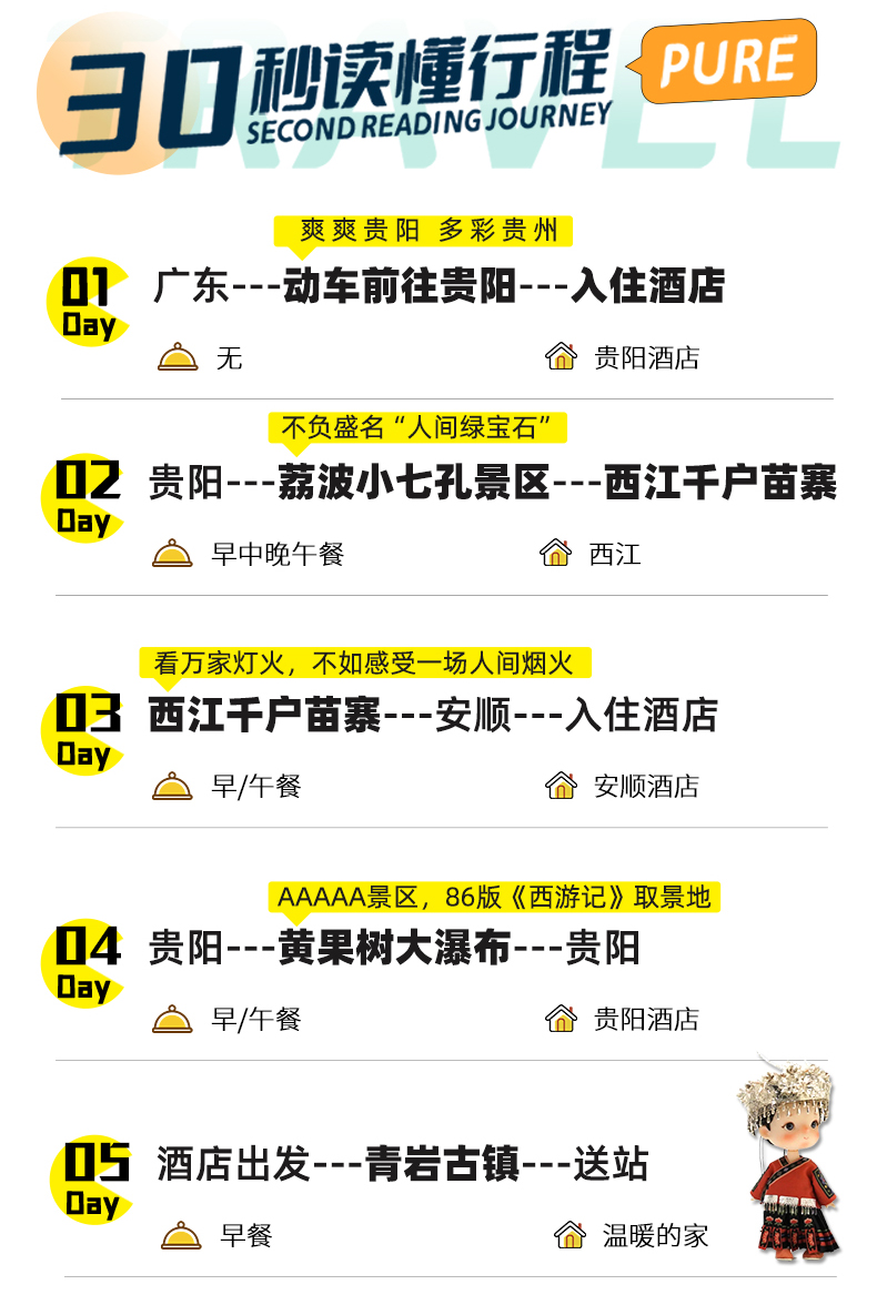 2. 不含景区必消小交通:黄果树大瀑布观光车50元/人+保险10元/人、小七孔观光车40元/人+保险10元/人、西江4程观光车20元/人+保险10元/人,青岩观光车25元/人,费用需自理。总合计165元