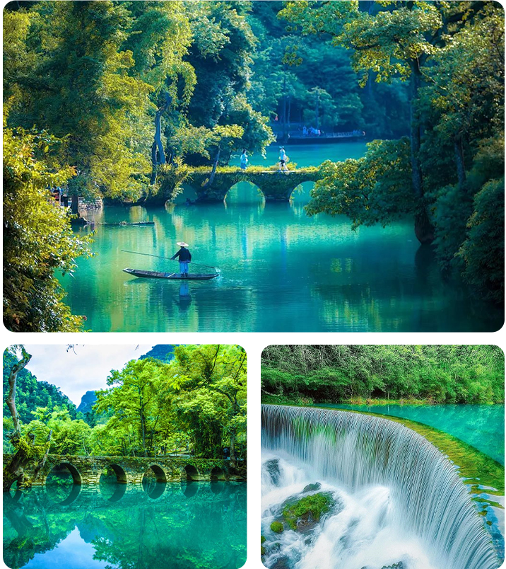 景区全长7公里,得名于响水河上一座建于清道光年间的小七孔桥,融山、水、洞、湖、瀑为一体,巧夺天工,浑然天成。有悠蓝深邃的卧龙潭,林溪穿插的水上森林,潭瀑交错的六十八级瀑布,飞流狂泻的拉雅瀑布,古风亦存的七孔古桥,一起去探寻地球绿宝石的神奇与瑰丽。