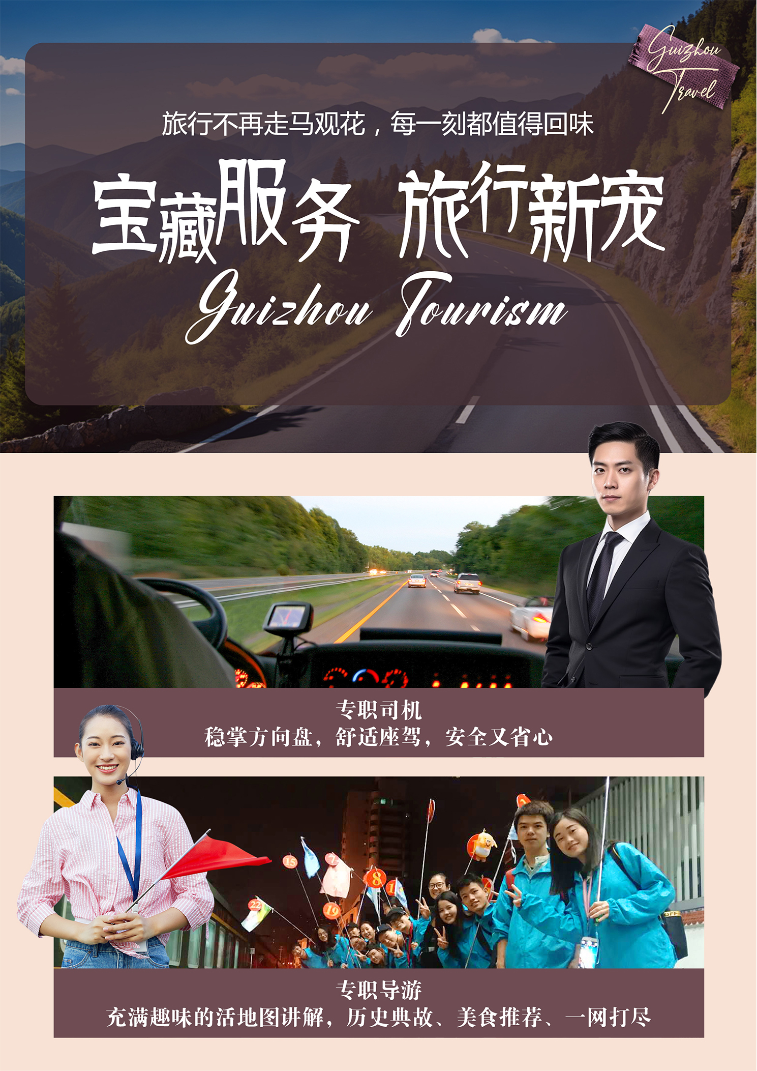 4. 贵州景区普遍较大,因团队中各家庭游览速度快慢不一,为避免影响贵宾行程体验,导游会在车上统一讲解,告知景区游览线路、主要特色、集合时间和地点,在关键的路口指引游览方向并执行部分讲解职能,进入景区后自由活动。