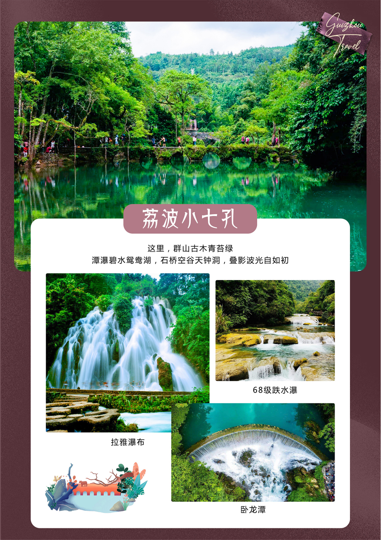 景区全长7公里,得名于响水河上一座建于清道光年间的小七孔桥,融山、水、洞、湖、瀑为一体,巧夺天工,浑然天成。有悠蓝深邃的卧龙潭,林溪穿插的水上森林,潭瀑交错的六十八级瀑布,飞流狂泻的拉雅瀑布,古风亦存的七孔古桥,一起去探寻地球绿宝石的神奇与瑰丽。