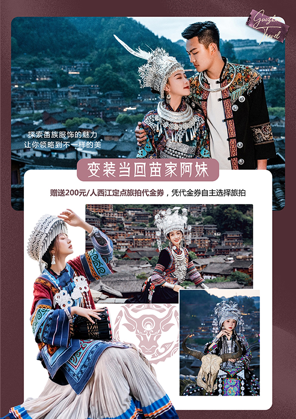 6. 赠送200元/人西江定点旅拍代金券(可在西江指定旅拍点使用,不可折现,单张代金券只能使用一次)。