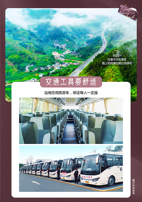 2. 不含景区必消小交通:黄果树大瀑布观光车50元/人+保险10元/人、小七孔观光车40元/人+保险10元/人、西江4程观光车20元/人+保险10元/人,青岩观光车25元/人,费用需自理。总合计:165元