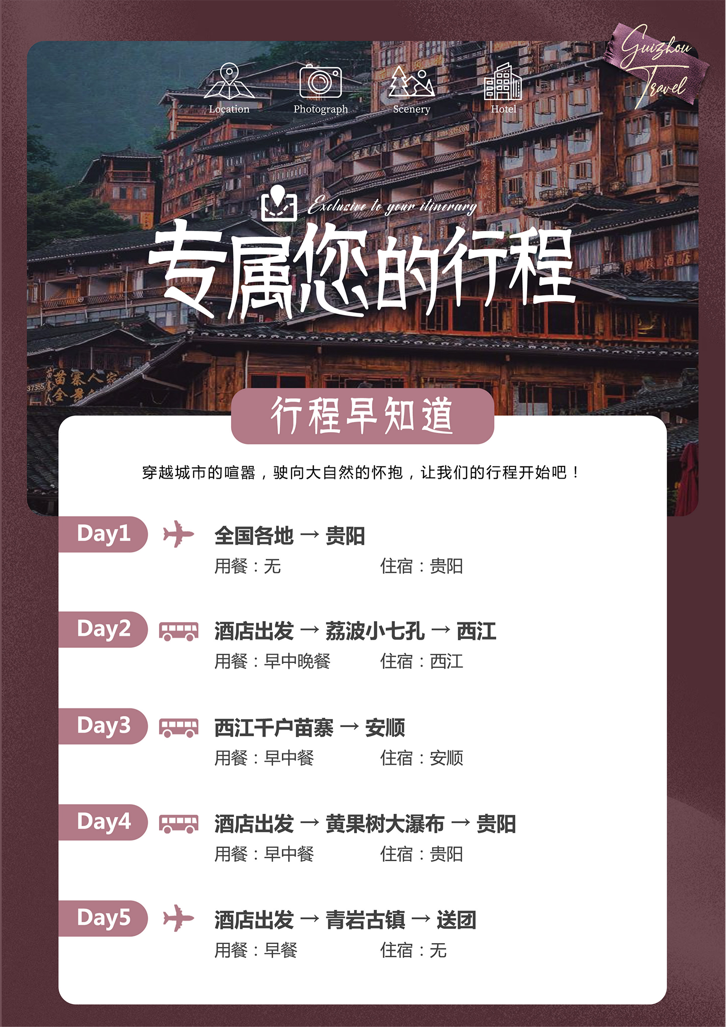 2. 住宿:三晚商务精品酒店+1晚西江精品客栈,如需单人用一间房请自行另补单房差或者接受安排拼房。