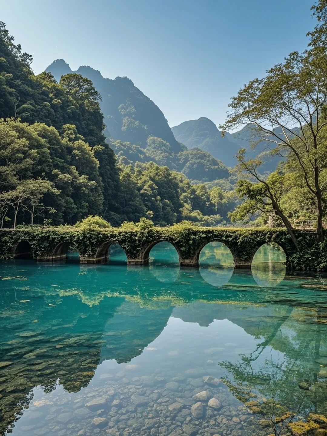 小七孔古桥,景区之名由桥而得。这是一座小巧玲珑的七孔古石桥,桥长25米,桥面宽4米,拱高4米,建于清道光15(1836)年,昔为沟通荔波至广西的重要桥梁。