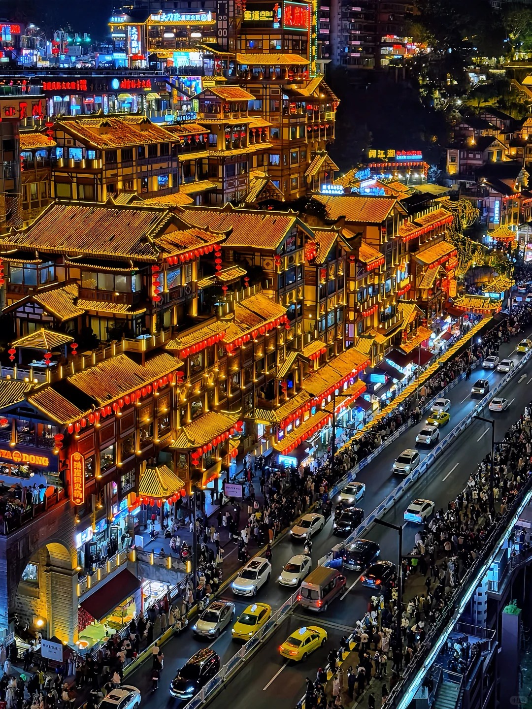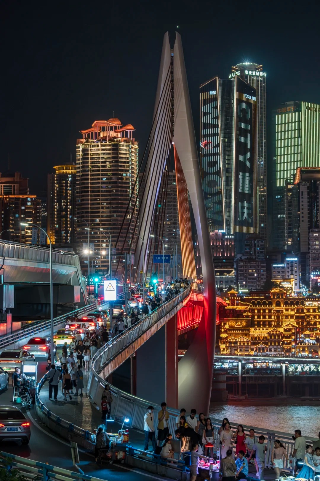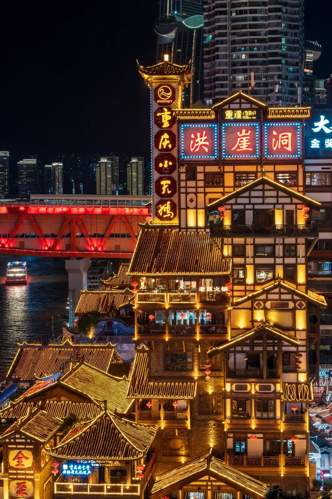 【网红重庆洪崖洞】栏式建筑吊脚楼,依山就势,沿江而建,房屋构架简单,开间灵活、形无定式,让解放碑直达江滨。随坡就势的吊脚楼群,形成线性道路空间,吊脚楼的下部架空成虚,上部围成实体。洪崖洞是重庆历史文化的见证和重庆城市精神的象征。