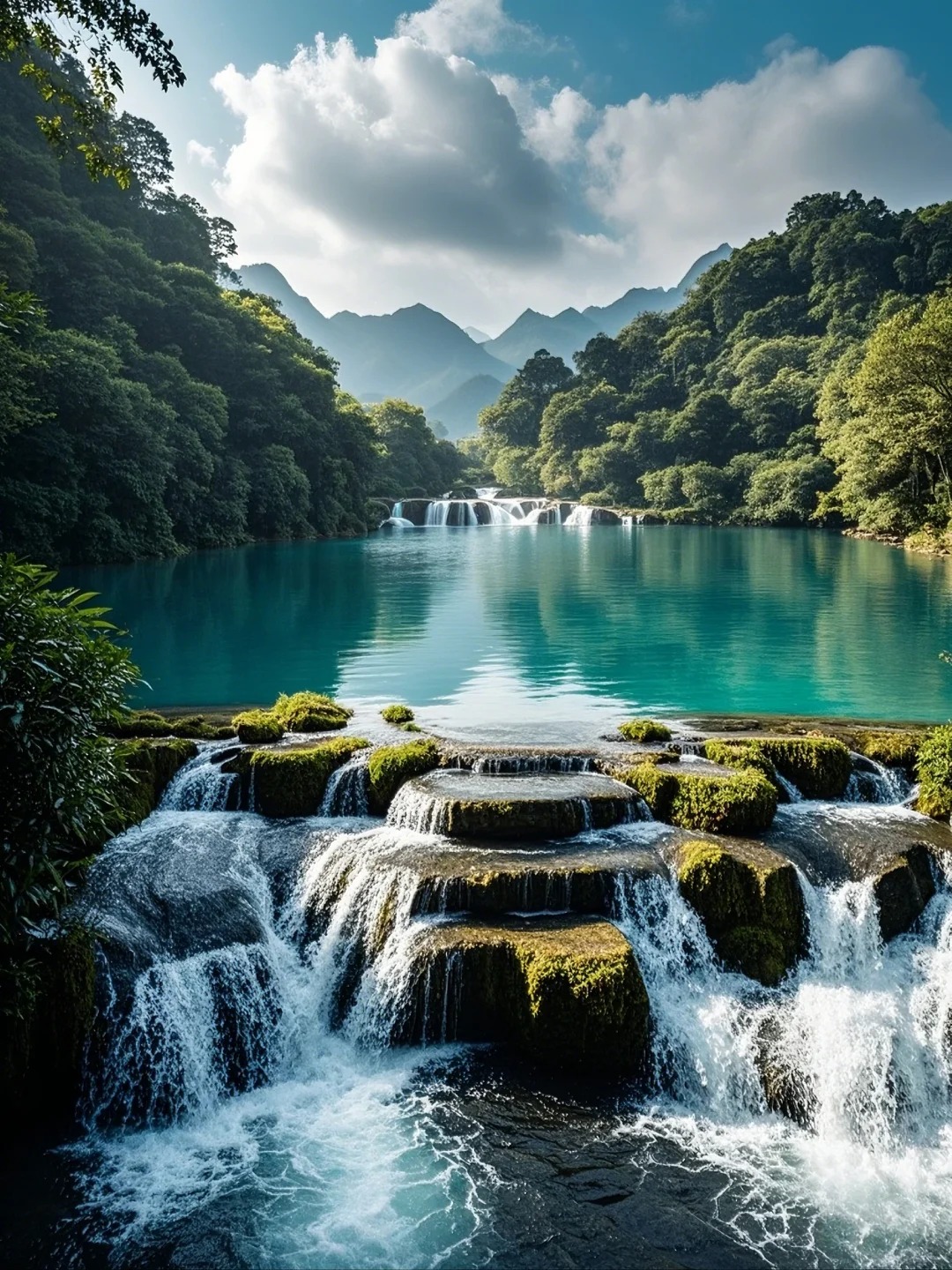 68级跌水瀑布--涵碧潭上游长1.6公里的狭窄山谷里,沿高高低低的河床,错落着68级瀑布和跌水。层层叠叠的瀑布,淙淙哗哗倾泻而下,或倾珠撒玉,推雪拥云,或如匹练飘逸,似银河泻地,形态各异,气象万千。