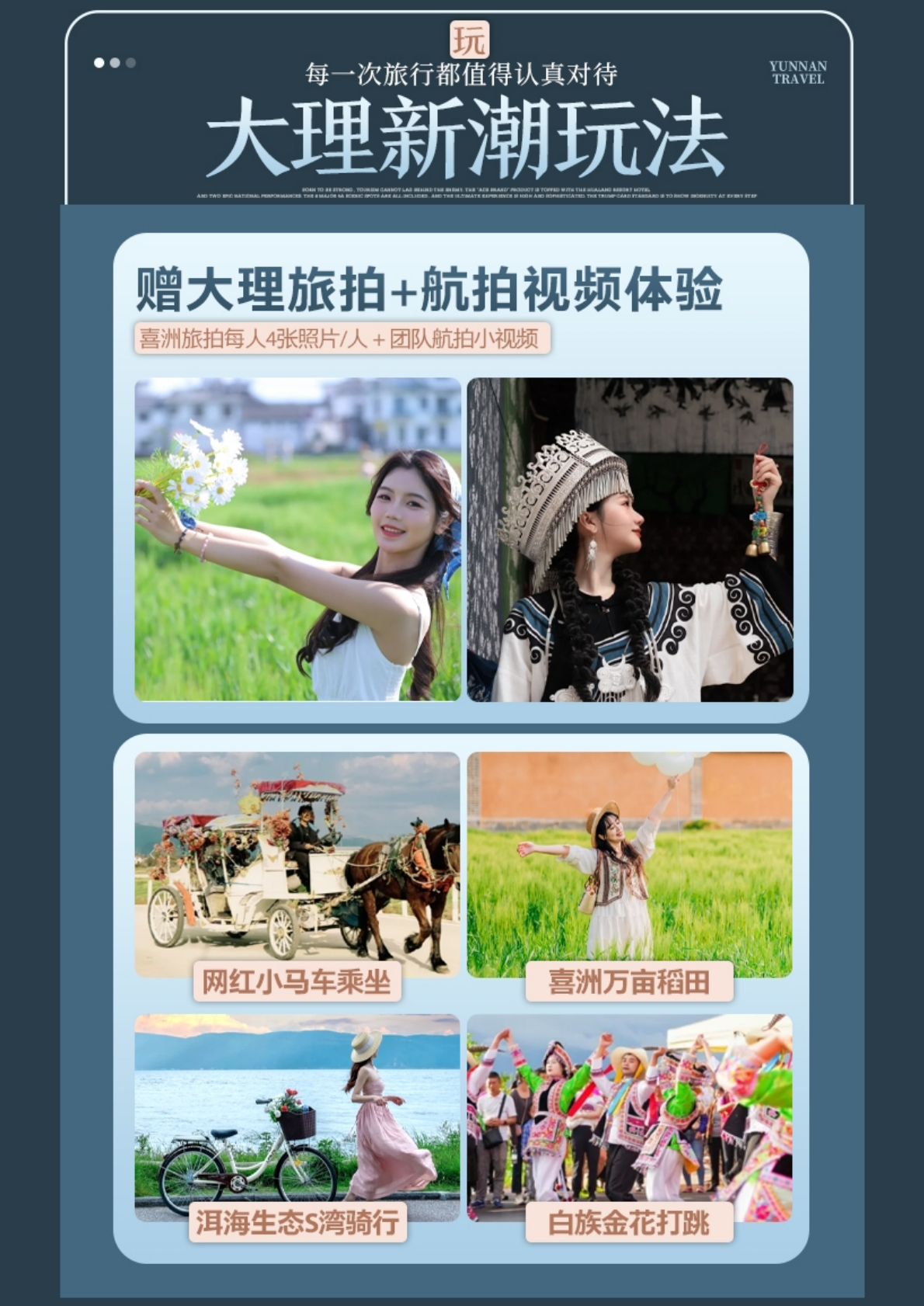 赠送旅拍+航拍 双体验(以家庭为单位,每个家庭提供4张电子照片,每团1个60秒小视频)洱海边生态廊道,客人在蓝天白云的映照下,感受着不需要滤镜的苍山洱海,在廊桥S湾你体验靓丽风景的同时,摄影师也会帮你定格下这一难忘惬意的大理时光。