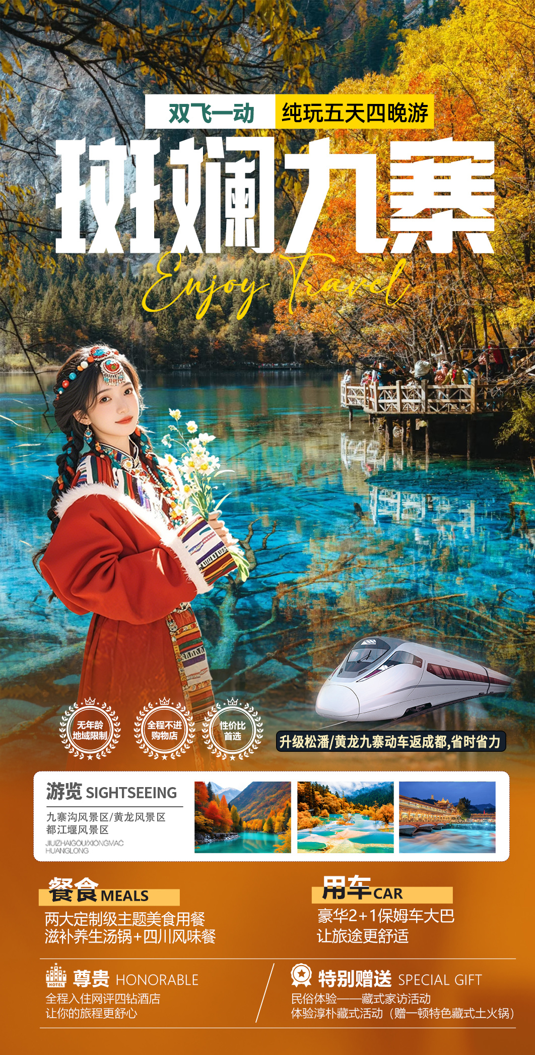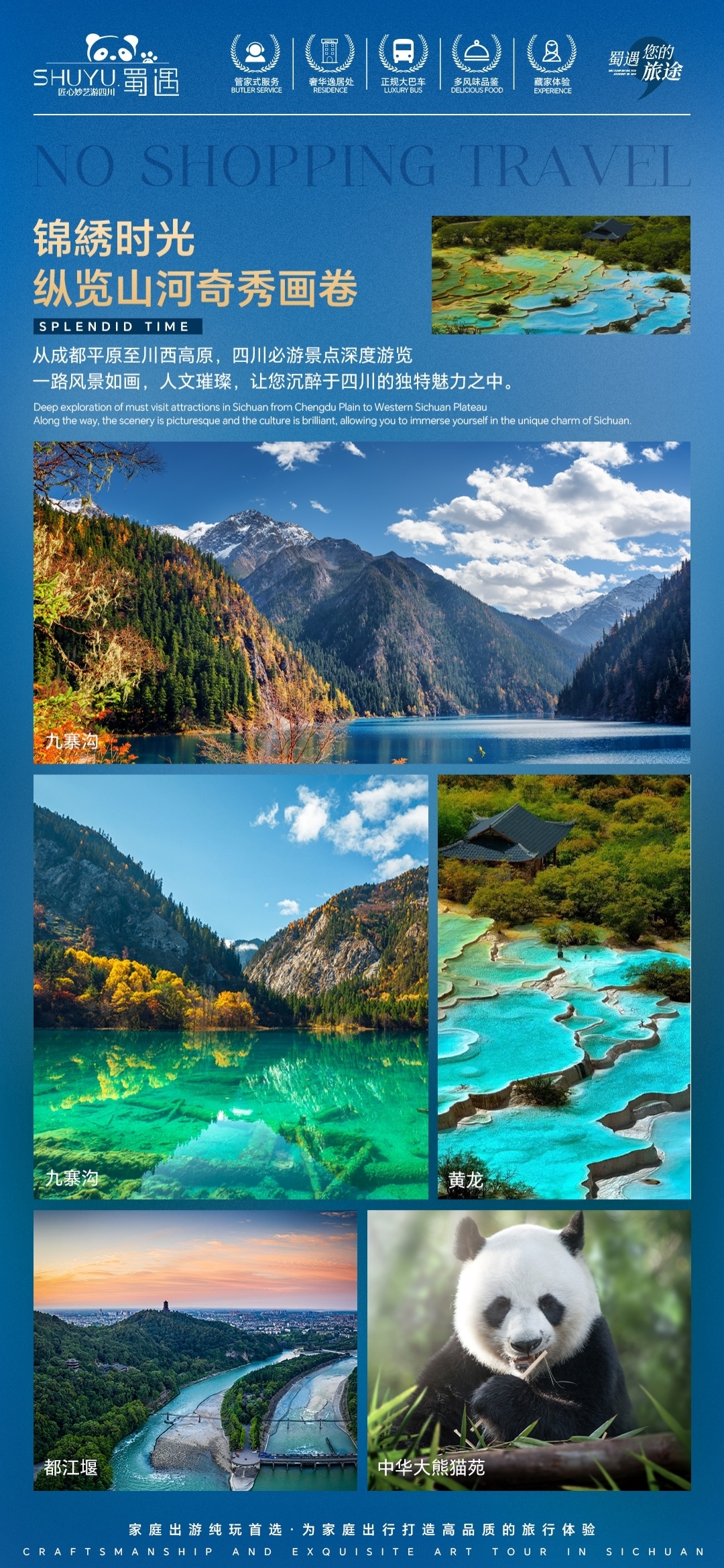 [游览] — 九寨沟风景区、黄龙风景区、都江堰风景区 [尊贵] — 全程入住网评四钻酒店, [纯粹] — 无年龄地域限制,全程不进购物店,不推荐任何自费娱乐项目,家庭出游首选 [独家] — 有趣的玩法百里挑一,不走常规的纯玩九寨之行 [餐食] — 九寨沿线两大特色餐+藏式民俗美食,餐餐惊喜餐餐地道 [礼遇] — 外宾服务礼遇、智能云端专享客服、最优导游带团资格、豪华空调大巴 ![]() |