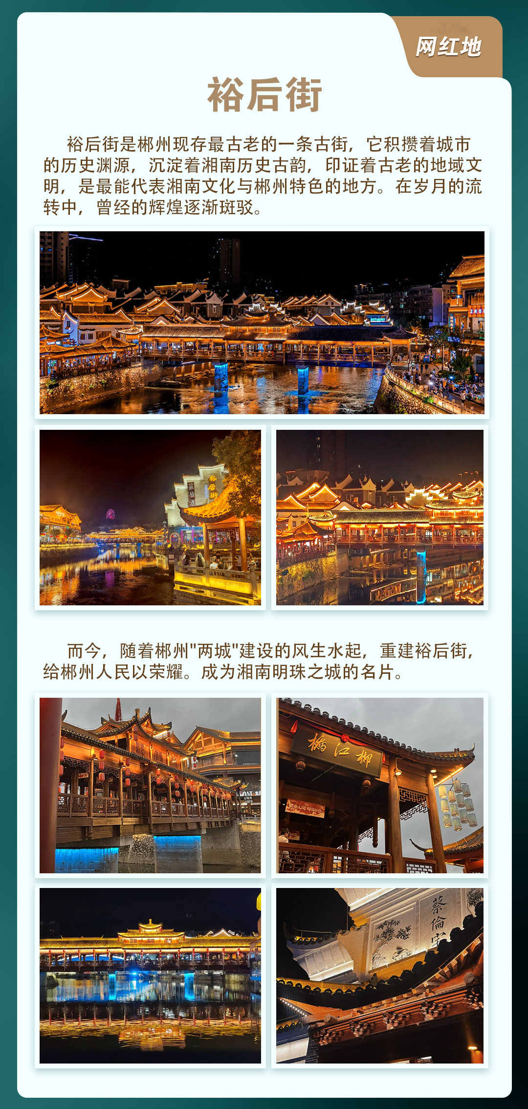 晚上自由活动,自由约伴晚餐;晚饭后逛郴州的“凤凰古城”裕后街,欣赏夜色,享受当地美食,想旅拍的小伙伴可以租个民族服饰旅拍哟;