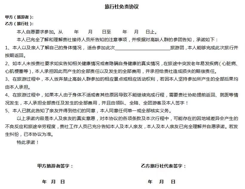 8. 因天气自然灾害或其它不可抗拒因素(如塞车、天气、车辆故障等)造成行程延误或不能完成景点游览或影响往返的交通时间,本俱乐部不承担由此造成的损失及责任。