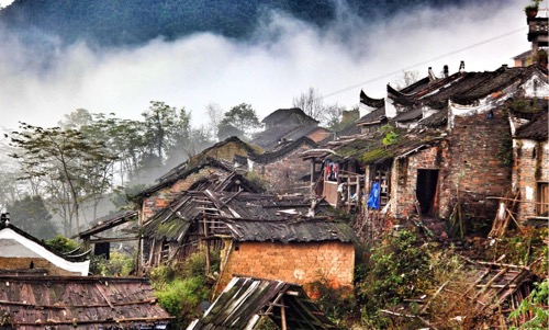15:30左右油岭瑶寨停车场,由于油岭瑶寨尚未开发,比较原生态,路比较窄小,大巴不能开进去,需要徒步半个小时左右到寨里,然后开始摄影拍照(山下瑶寨房屋多是青砖木瓦、底层用石头砌成,木桩加固支撑顶层。二层外面,木头和栅栏围起来一个小院,摆上石桌石凳,闲来聊天。寨子内石板巷道纵横交错,将家家户户连接起来。