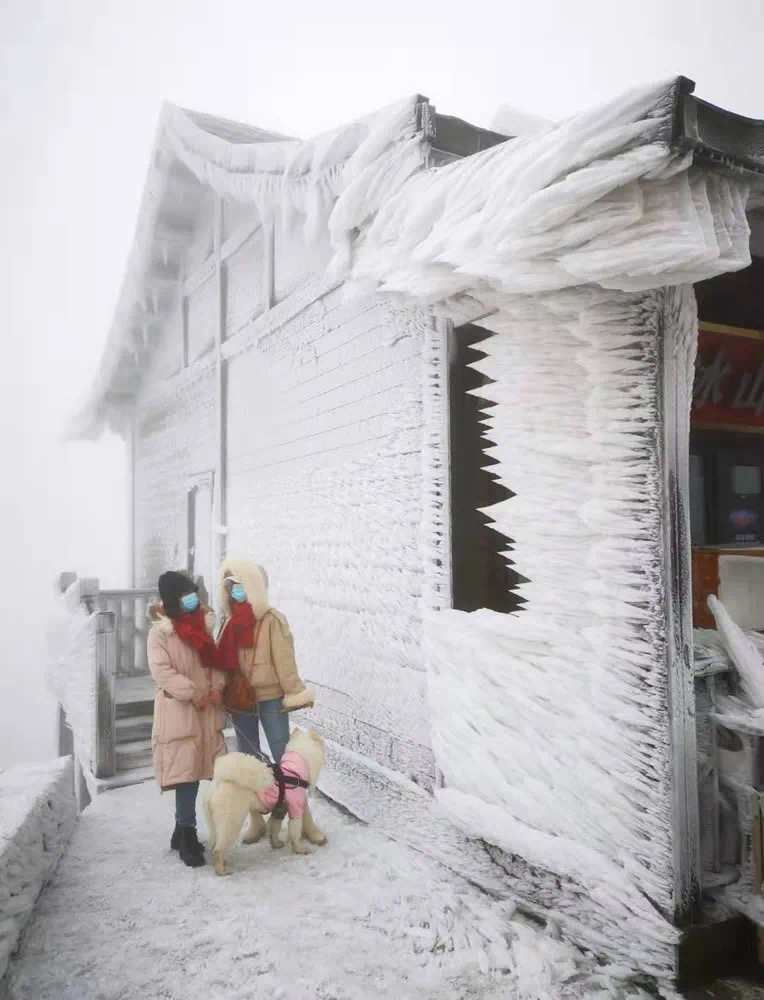 到了冬季,这里有南方难得一见、最吸引人的冰雪风景。随着天气降温,接连几天跌破冰点的气温让云冰山上的冰挂越积越厚,从半山腰一直到山顶,所有草木都披挂上一层冰霜,一派北国风光。