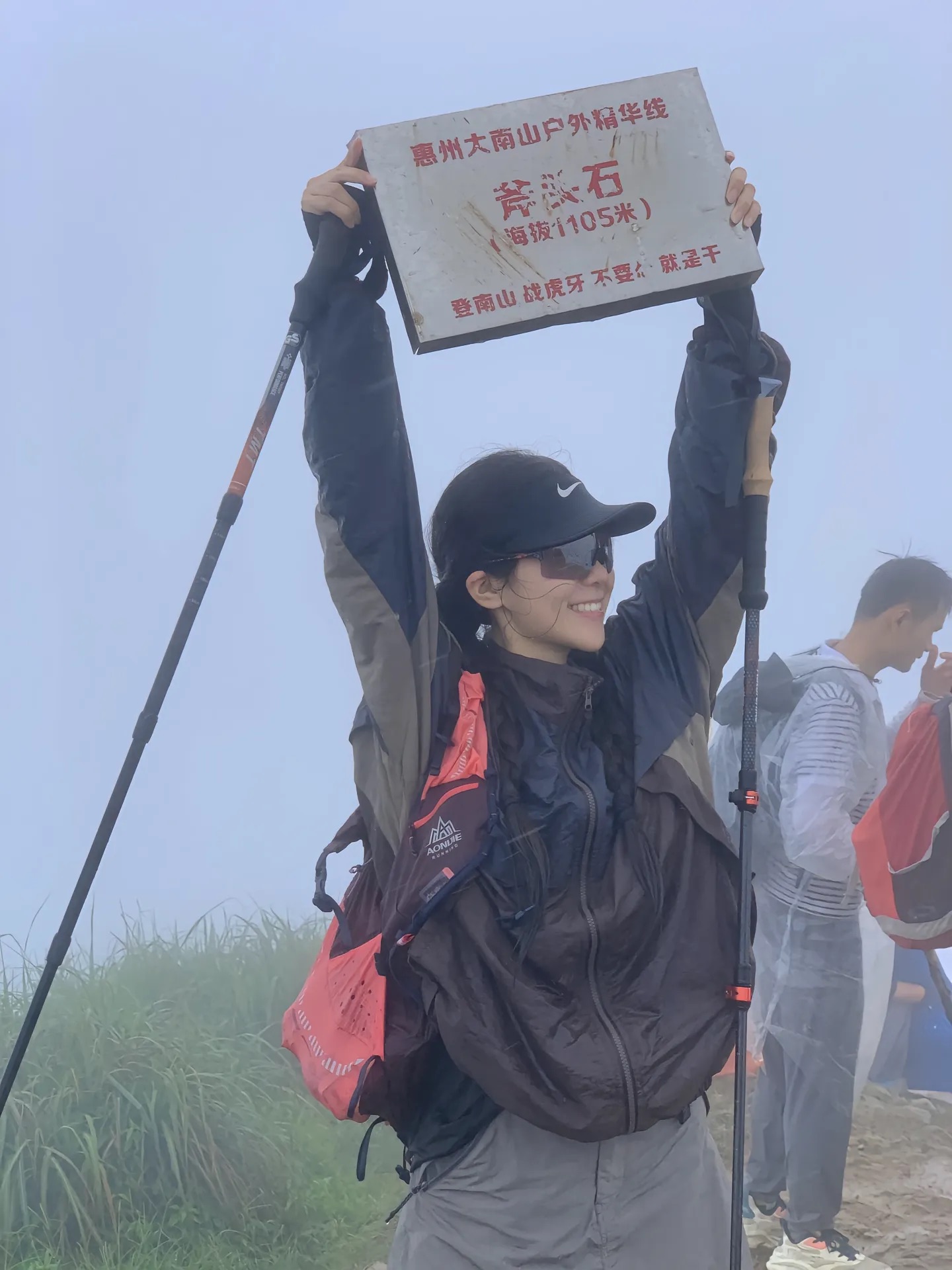 登山杖,防晒袖套,帽子、汗巾、相机,对讲机,充电宝等。