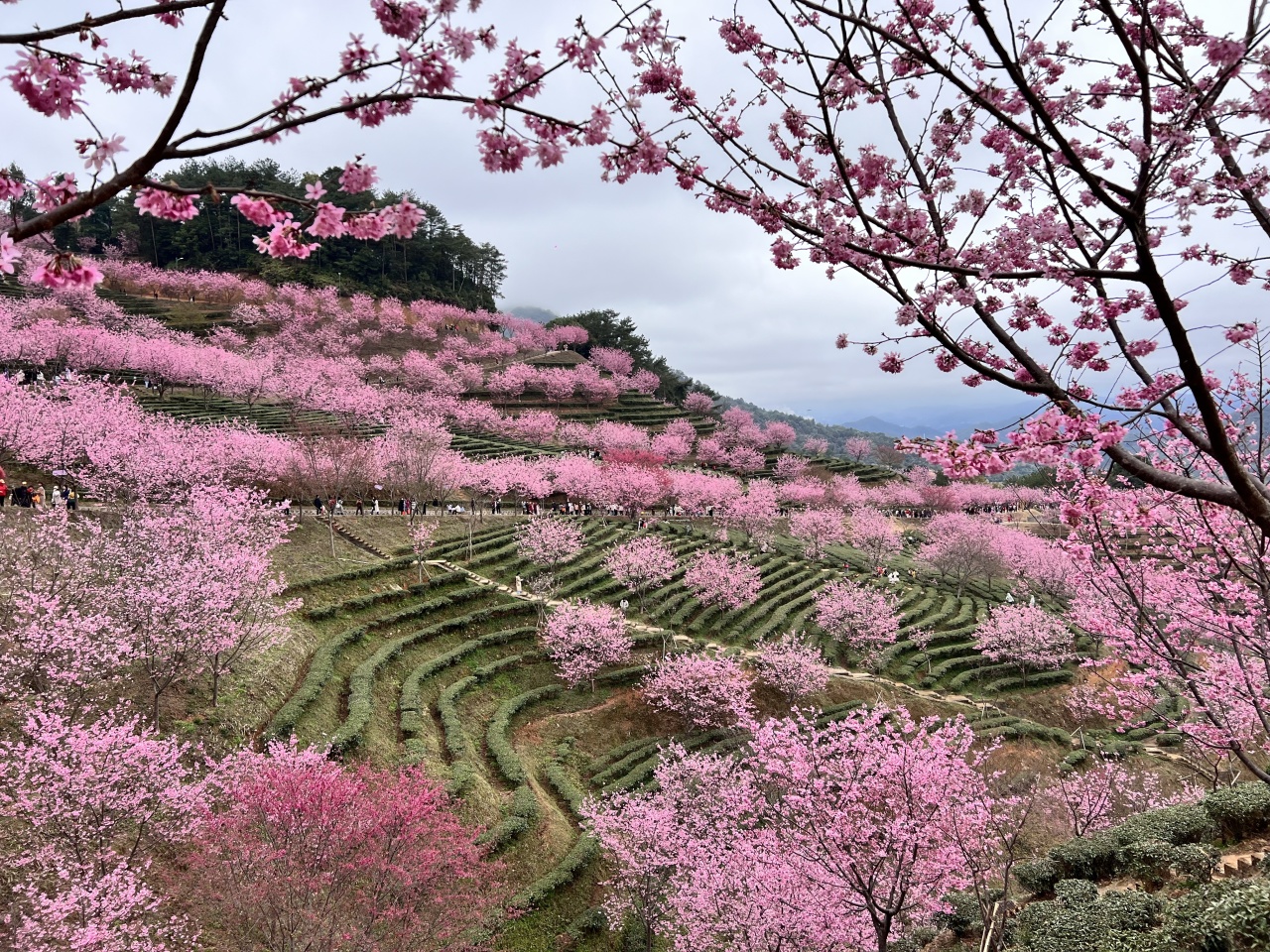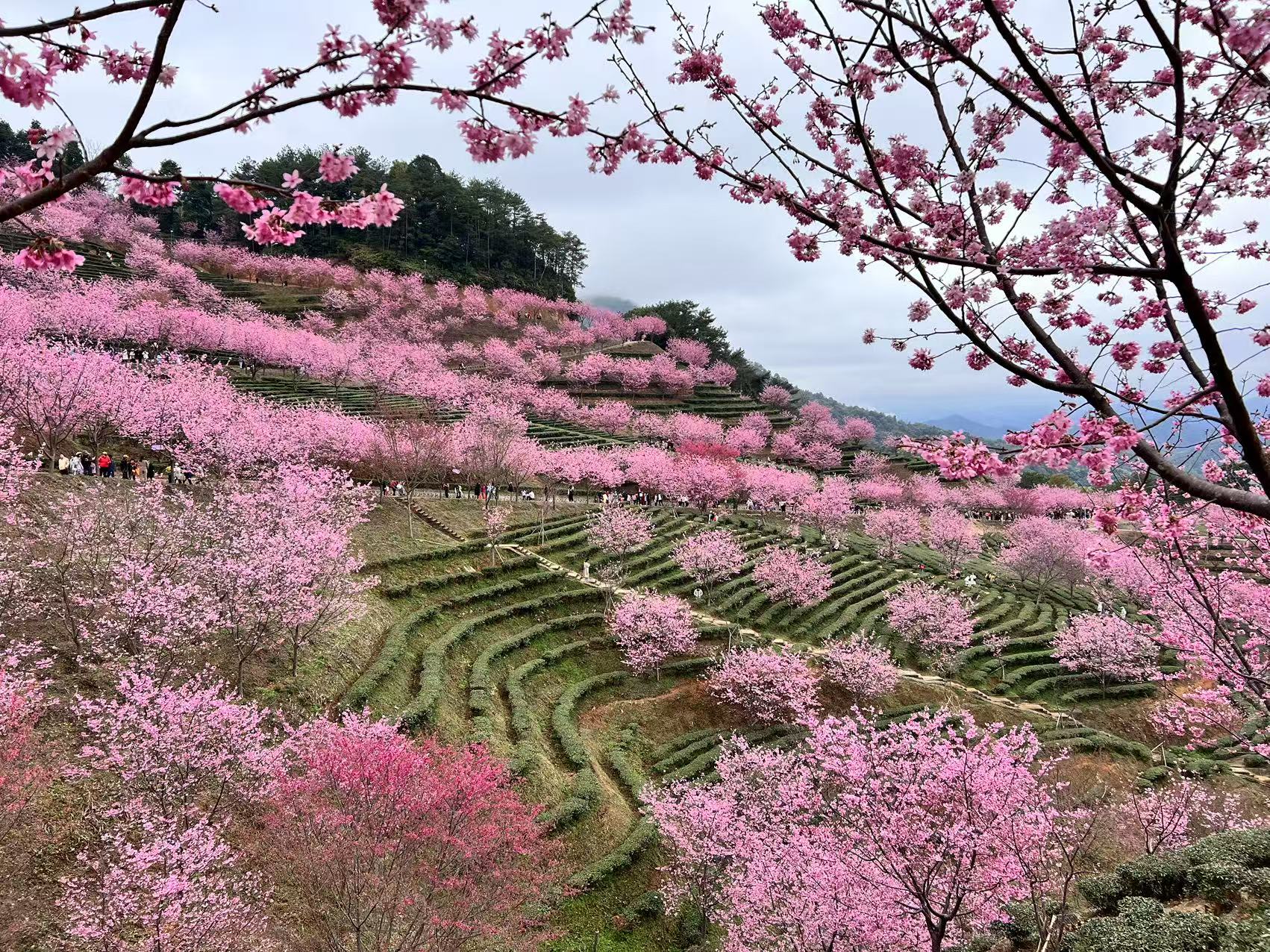 梅州阴那山樱花---广东最美的茶园樱花,千亩茶园,万株樱花,层层叠叠,山野间的绿色茶丛之间,玫红与浅粉的樱花交相辉映,美不胜收!