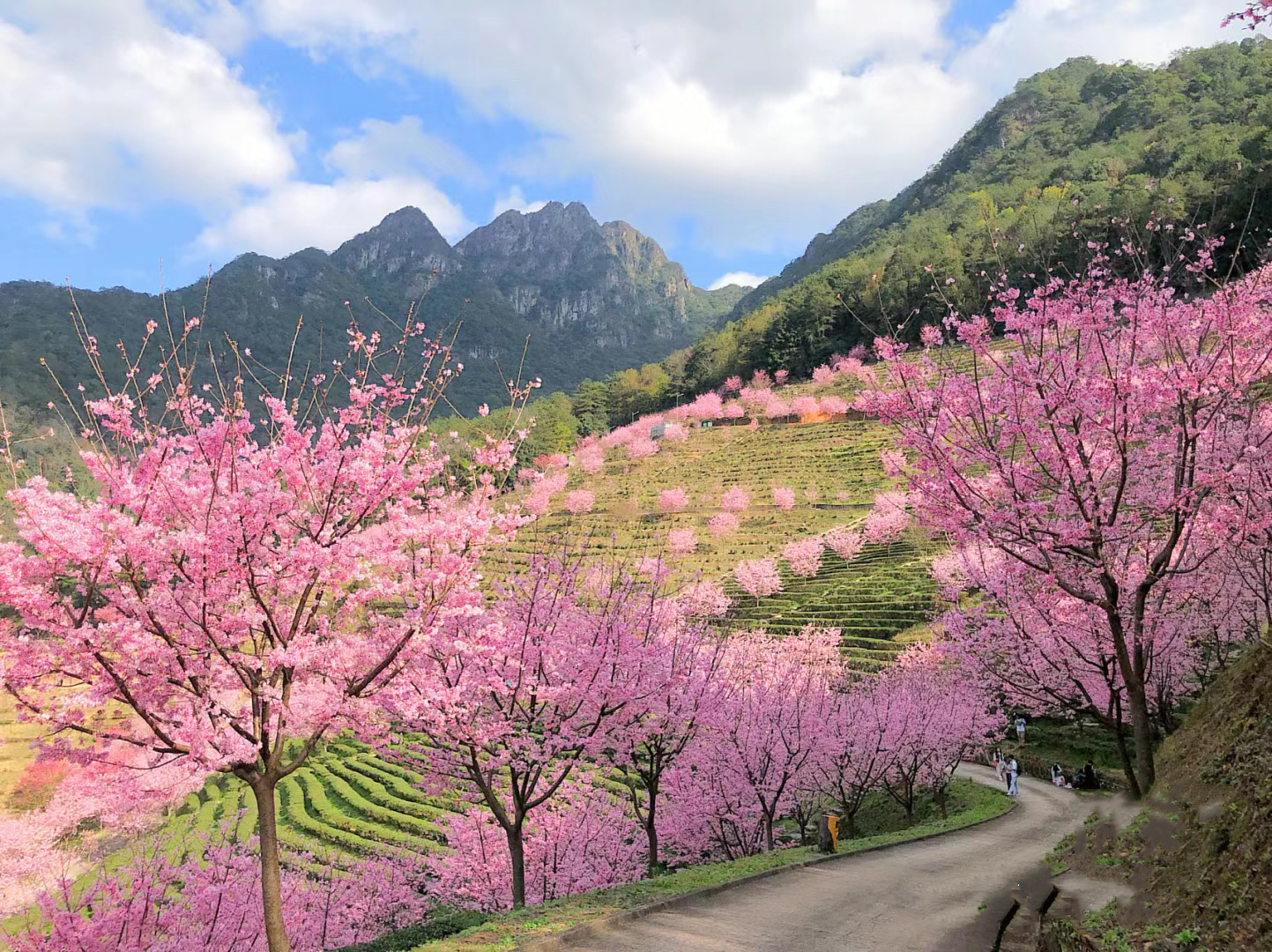 千亩茶园,万株樱花,迎春暂放,漫山遍野的粉色花朵,点缀在四季常青的茶园内,层层叠叠,烂漫无比,深深吸上一口充满花香与茶香的空气,沁人心脾...